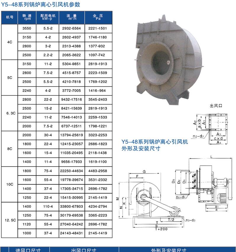 Y5-48系列锅炉离心引风机,是为适应燃用各种煤质并配有消烟除尘装置的工业锅炉(1-20吨/小时)而配套设计的。凡进气条件相当,性能又适应者均可选用。但最高温度不得超过250℃,风机的介质烟气Y5-48No4C-6C气体温度为200℃。气体密度为0.745kg/m3。N o8C-12.5C气体温度为140℃;气体密度为0.851kg/ m3。在引风机前,必须加除尘装置,以保证进入风机的烟气含尘量小于400kg/ m3。在引风机前必须加装效率不低于85%的除尘装置,降低进入风机的烟气含尘量,以利提高风机寿命。