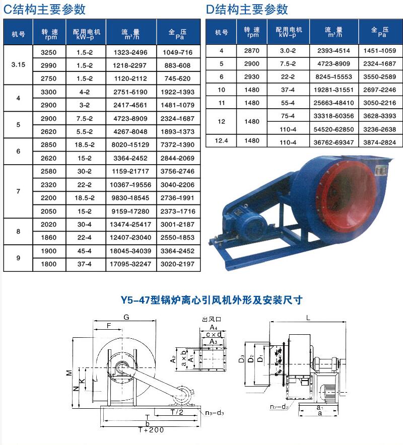 Y5-47型锅炉离心引风机 Y5-47型锅炉离心引风机具有噪声低、结果简单、灵活调节风量、风压的特点,适用于燃用各种煤质并配有消烟除尘装置的工业锅炉。输送气体温度≤250℃。该风机传动方式有C式和D式两种、带水冷整体轴承座和风量调节门。如选用减振器、用户可直接将风机放置在水泥地平面上,而无需地脚螺栓,易于安装调式。