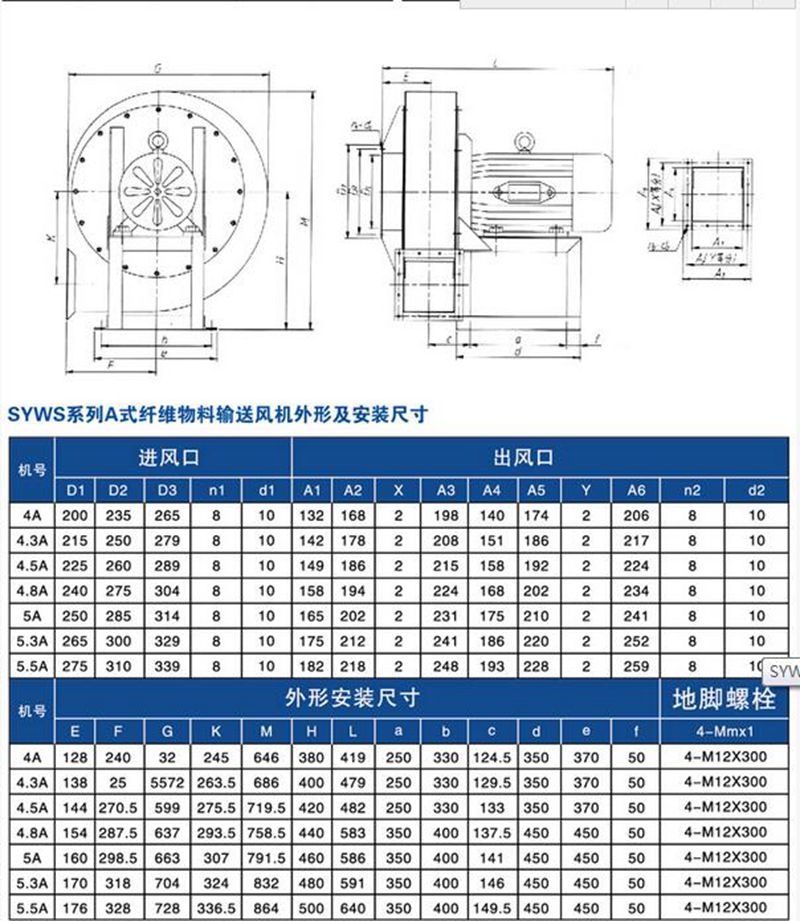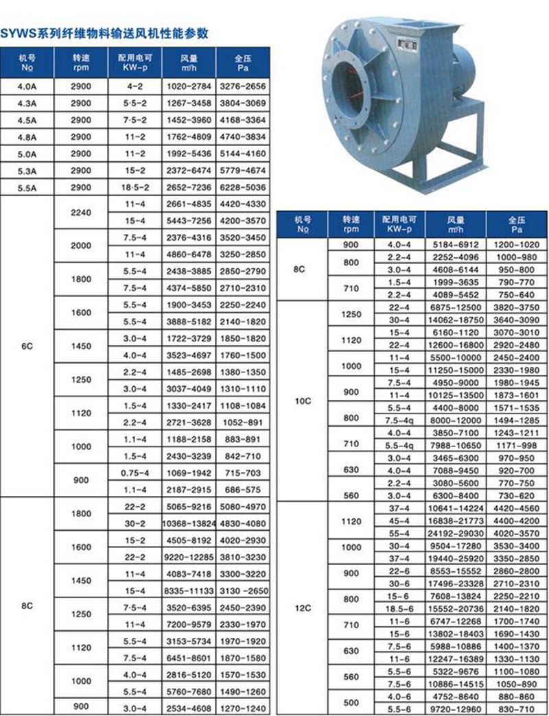 SYWS系列纤维物料输送风机 SYWS系列纤维物料输送风机为纺织行业设计制造的物料纤维输送专用风机,用于输送棉花、化纤、刨花、木屑等,有左旋和右旋两种型式,均为单吸入,出风口位置左、右均可制成0°、45°、90°、135°、180°、225°、270°等角度。