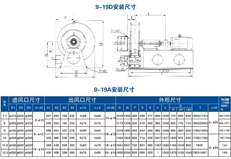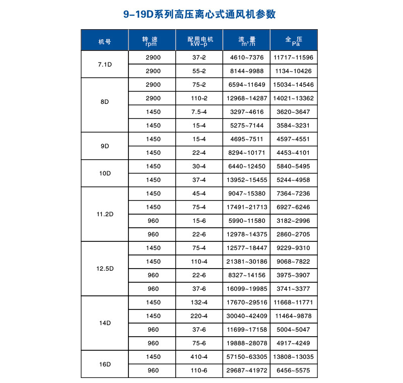 9-19D系列高压离心式通风机 9-19D系列高压离心通风机可广泛用于输送物料、空气及无腐蚀不自燃、不含粘性物质的气体。输送的介质温度一般不超过80℃,所含尘土及硬质颗粒不大于150mg/m3,适用于一般锻冶、玻璃、陶瓷、无线电、电镀、蓄电池等行业的高压强制通风和粮食、饲料、矿粉、塑料等加工行业的物料输送。