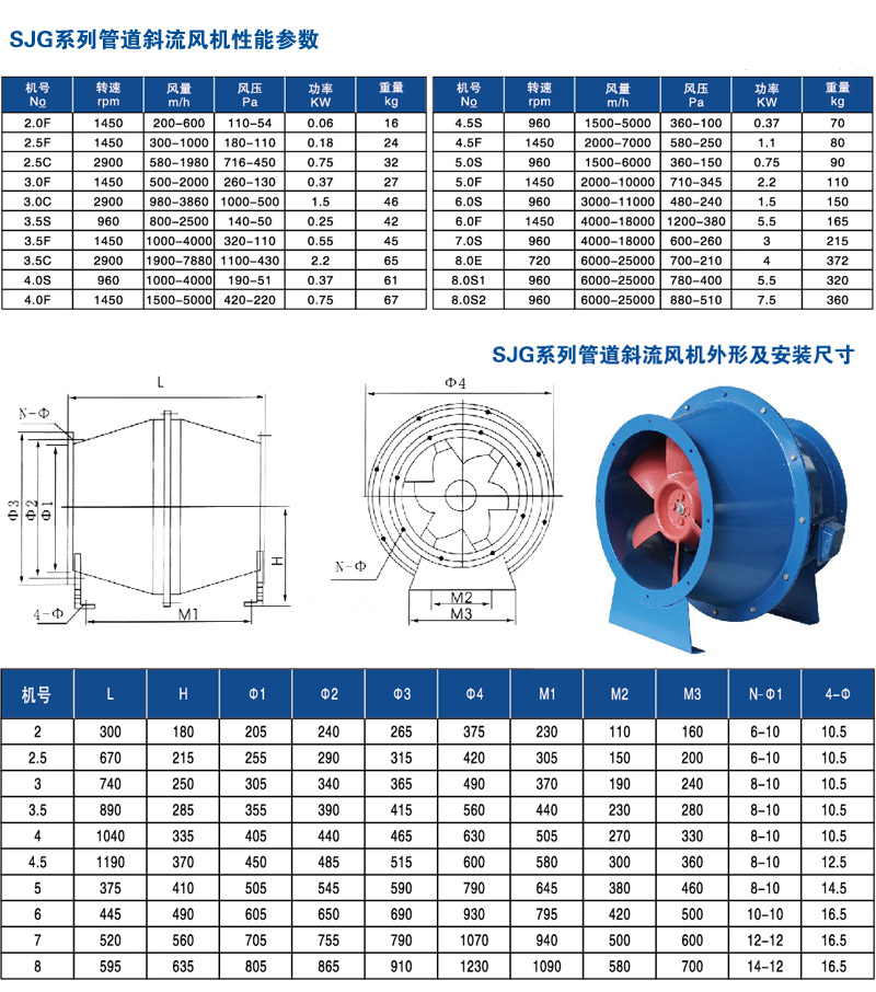 SJG系列管道斜流风机应用斜流子午加速设计方法,采用鼓形风筒、锥形轮毂、扭曲叶片结构形式。兼有离心式风机压力系数较高和轴流式风机流量系数较大的特点,具有噪声低、耗电省、结构紧凑等优点,卧式、立式安装均可。广泛适用于工业和民用建筑的送排风系统。