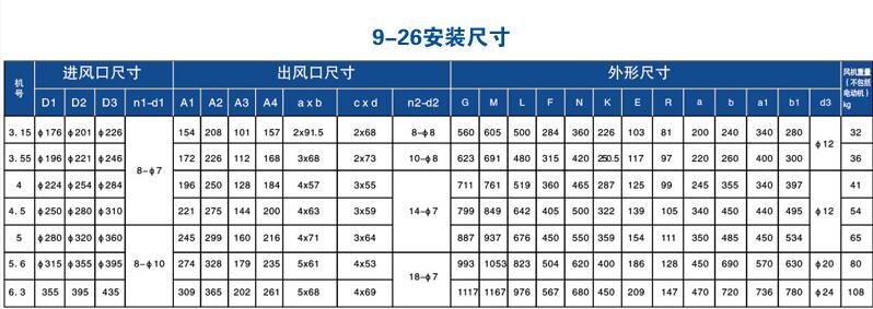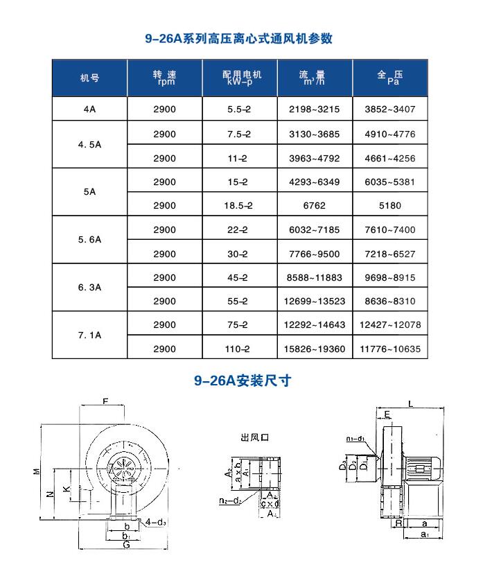 9-26A系列高压离心式通风机 9-26A系列高压离心通风机可广泛用于输送物料、空气及无腐蚀不自燃、不含粘性物质的气体。输送的介质温度一般不超过80℃,所含尘土及硬质颗粒不大于150mg/m3,适用于一般锻冶、玻璃、陶瓷、无线电、电镀、蓄电池等行业的强压强制通风和粮食、饲料、矿粉、塑料等加工行业的物料输送。